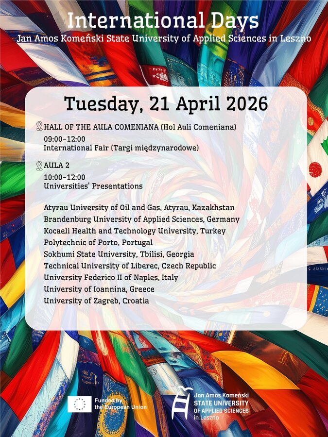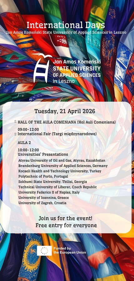 Akademia Nauk Stosowanych im. Jana Amosa Komeńskiego w Lesznie zaprasza do udziału w wydarzeniu International Days, które stanowi doskonałą okazję do poznania możliwości studiowania za granicą, a także realnych korzyści, jakie program Erasmus+ oferuje studentom naszej uczelni.