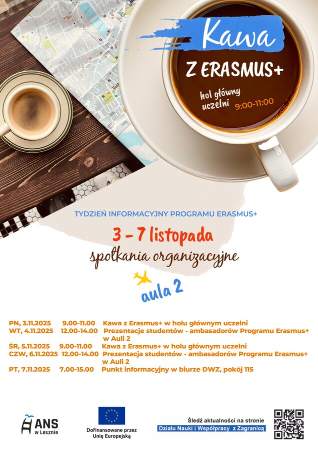 ŚR, 5.11.2025 9.00-11.00 Kawa z Erasmus+ w holu głównym uczelni