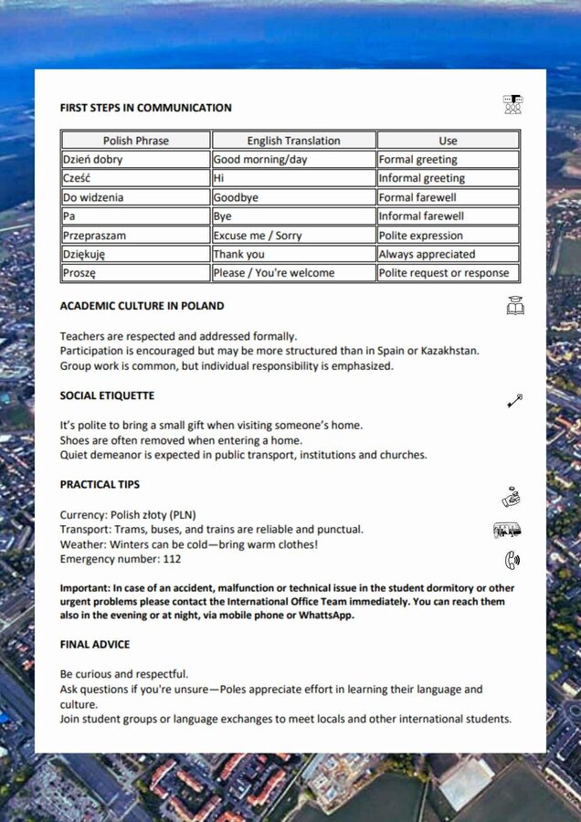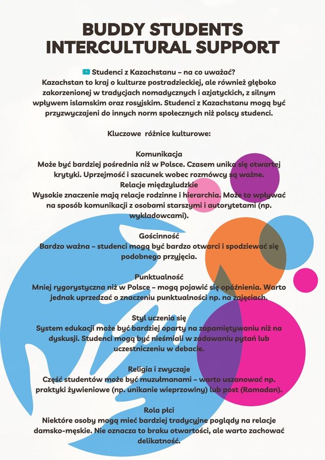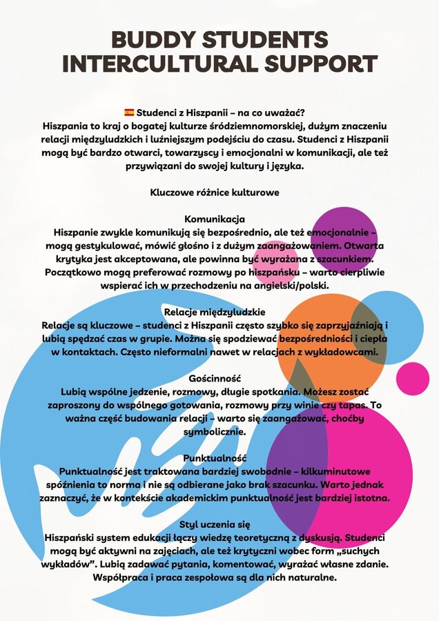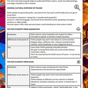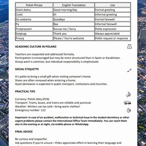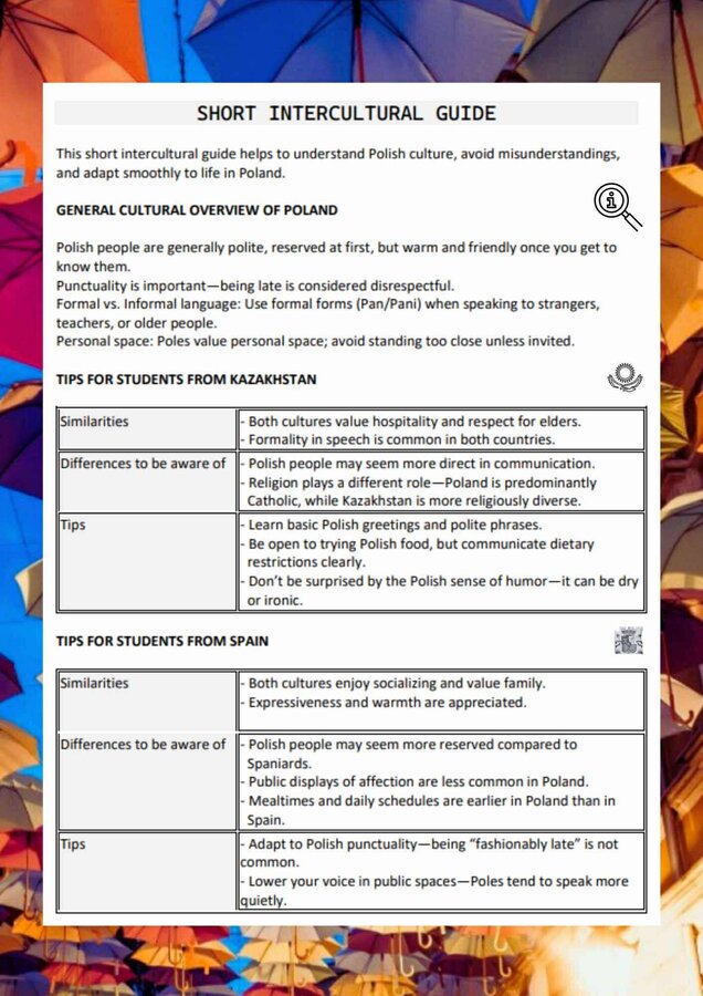 Poniżej załączamy ważne informacje dotyczące różnic kulturowych, które mogą pomóc w lepszym zrozumieniu i budowaniu relacji między naszymi studentami a gośćmi z zagranicy oraz szczegółowy program Welcome Week.